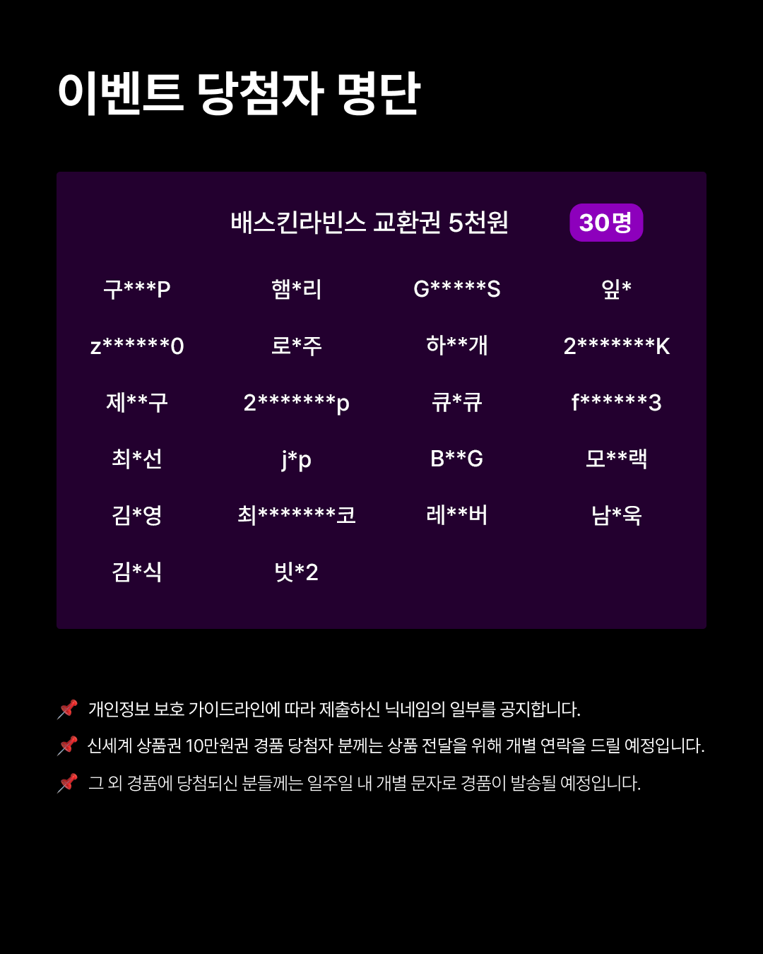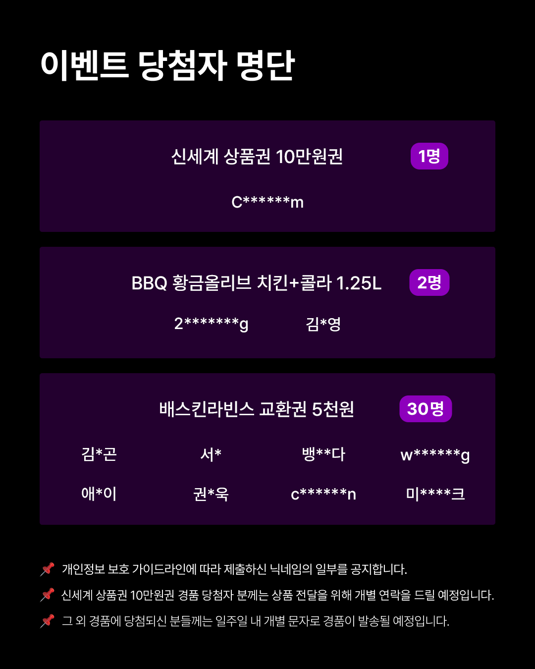 ※ 개인정보 보호 가이드라인에 따라 제출하신 닉네임의 일부를 공지합니다.